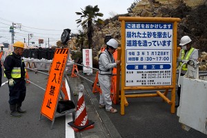 県は25日、いわき市鹿島町久保の県道小名浜・平線(通称・鹿島街道)で、昨年8月に発生したがけ崩れについて、復旧工事に着手した。最初の段階として、現場の測量などが行われており、予定通りであれば、3月10日から岩の撤去や仮設防護策の設置に入る。