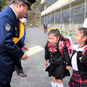 啓発活動は、6日に始まった「春の全国交通安全運動」に伴い、いわき中央署常磐分庁舎の神成淳所長ら10人が参加し、夜光反射材や子ども向けのバッグなどを配布しつつ、車に気を付けながら安全に登校するよう呼びかけた。