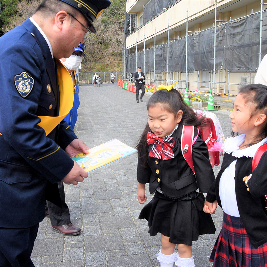 式典に先立ち、新入生とその保護者が登校するのに合わせ、校舎入り口で、いわき中央署常磐分庁舎、いわき常磐地区交通安全協会、常磐地区交通安全対策協議会による啓発活動が行われた。