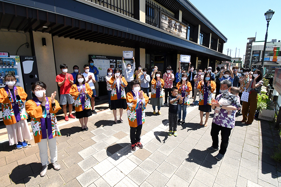 若松さんが会長を務める、いわき湯本温泉旅館の女将の会「湯の華会」が7日、手作りの布製マスク100個を市に寄贈した際、医療従事者などをたたえるため、毎週金曜日の正午から30秒ほど一斉に拍手を送る市の取り組みに賛同。市常磐支所や地元商店街の有志に声を掛け、急きょ実施することとなった。
