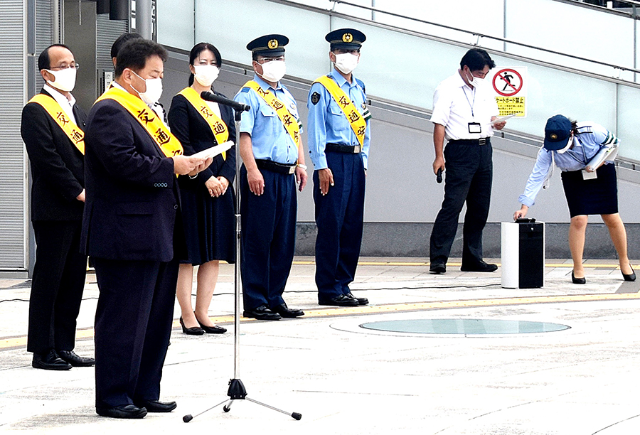 「令和2年秋の全国交通安全運動」(県、県交通対策協議会主唱)が21日から始まることに先立ち、いわき中央署(柴田泰弘署長)は18日午前、各種交通機関・団体と連携してJRいわき駅南口駅前イベント広場で出動式を行い、運動に向けて機運を高めた。