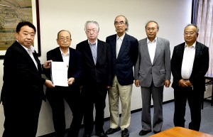 写真は、清水市長に要望書を手渡した小野代表(左から2人目)と各団体の代表・幹部=24日(クリックで拡大)