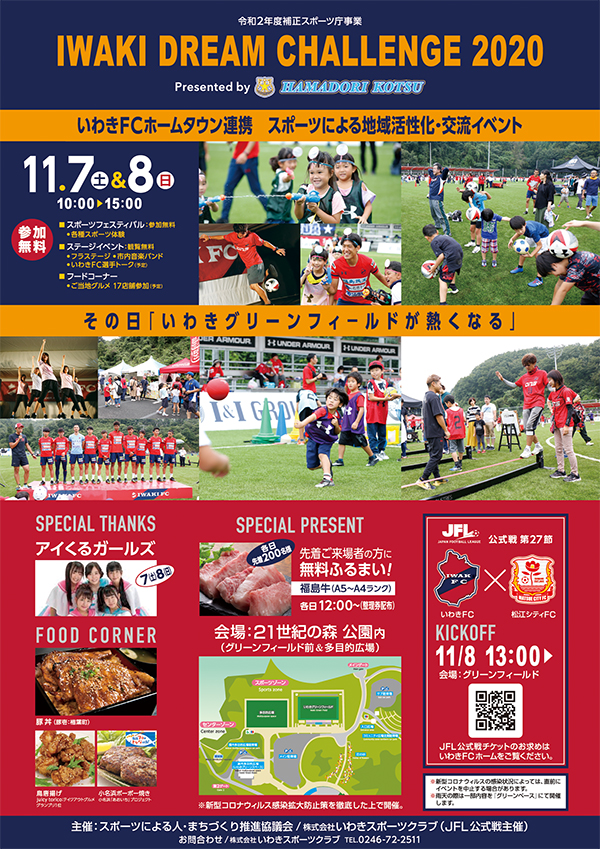 サッカー・いわきFC(日本フットボールリーグ=JFL)のホームタウン連携の一環として、スポーツによる地域活性化・交流イベント「いわきドリームチャレンジ2020」が11月7、8日、常磐湯本町の21世紀の森公園で開かれる。参加無料。時間は午前10時から午後3時まで。いわきドリームチャレンジは、いわきFCとともに、官民で地域活性化を進める「スポーツによる人・まちづくり推進協議会」が主催する。