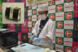 写真は、「又兵衛しまほっけ」(左上)と、おにぎりを作る厳選された社員=12日(クリックで拡大)