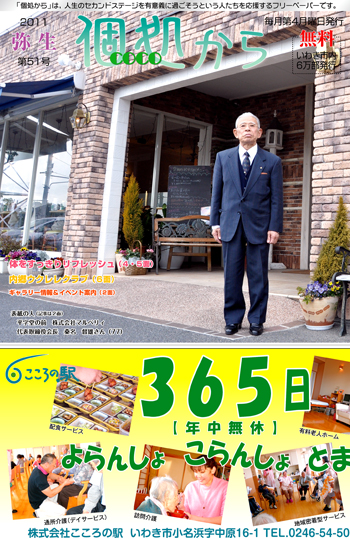 『ここ暮らす・個処から』 個処から 第51号 2011.02.22 Post この記事のタイトルとURLをコピーする PDFダウンロード PR:いわき市北部地域を中心に、児童養護施設、老人保健施設、特別養護老人ホーム、ケアハウスをはじめ、診療所とデイケア、デイサービス、居宅介護支援、訪問介護、訪問リハビリと多種多様な福祉、医療事業を展開。 個処から 第50号 前の記事 個処から 第52号 次の記事