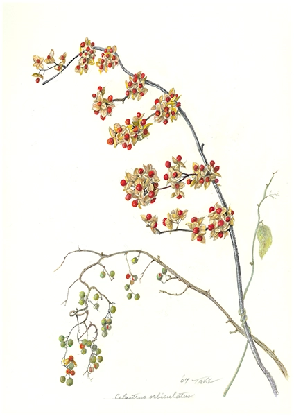 家にウメモドキはあるが、紅い実はとっくの昔に鳥に食べられて坊主になっている。ツルウメモドキはない。一度描いてみたいものだと思っていたところ、知人が知り合いの家の近くにあったと言って持ってきてくれた。