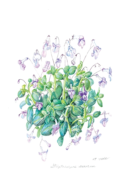 あるスーパーの入り口で数個の鉢花が並んでいた。サクラソウやラナンキュラスに混じって青紫色の小さな花を付けた鉢が2つあった。「ストレプトカーパス」という名札が付いていた。