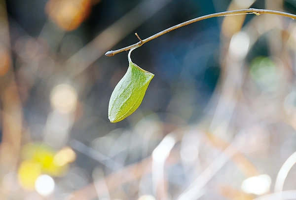 アカマツの根元のテントウムシや朽木の中のスズメバチなど、越冬昆虫の姿をイメージしつつ、ふと見上げたところで目にとまったのが、ウスタビガの繭(まゆ)だった。葉を落とした木の枝から、幅2㌢、長さ4㌢ほどのひときわ目立つ鮮やかな黄緑色をした袋状のものが柄で固定されて下がっていたのだ。