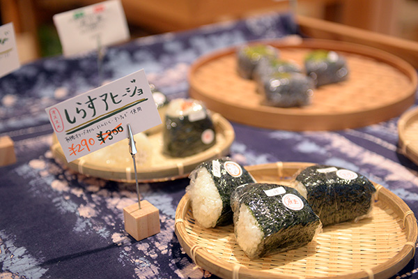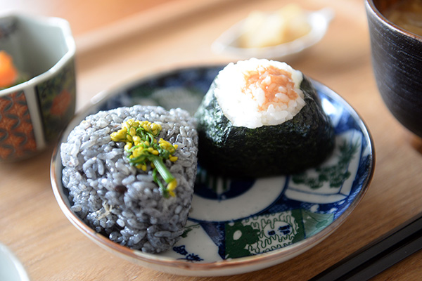 小林さんは都内でフードコーディネーターとして働きくなかでフードロス、農薬問題など現代の食環境に矛盾を感じ、現在は生産者として農業にも携わる。提供しているおむすびは園部さんの有機コシヒカリを用い、定番の「練り梅」や「新巻鮭」をはじめ、季節に合わせて「しらすアヒージョ」「麻炭」などの変わり種も登場する。おむすびの具材やおかず、みそ汁には店内で販売する有機食材が使われており、素材本来の甘みやおいしさを引き出している。