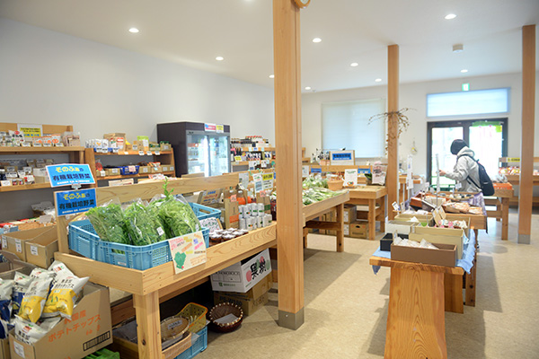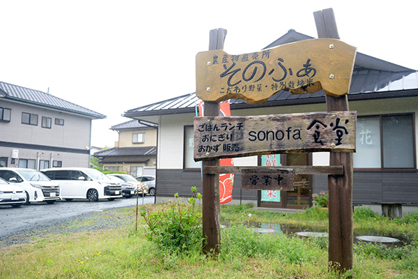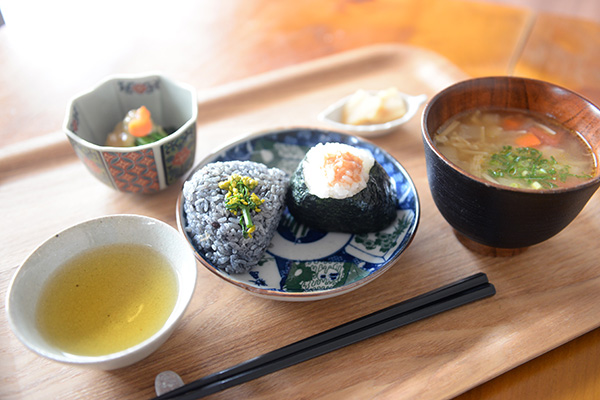 無農薬・有機栽培の米や野菜を生産している農産物直売所「そのふぁ」に併設するカフェコーナーで提供している、水曜日限定の体にやさしいランチ。現在は料理人の小林たえさん=ひょっとこ商事=考案のランチセットで、直売所に並ぶ数種類のおむすびを購入し、オーガニックの薬草茶、みそ汁(またはスープ)、おかず一品または漬物のランチセット(450円)と一緒に味わえる。