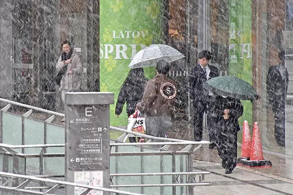 いわき地方は3日、本州南岸に停滞した前線や上空に入った寒気の影響で、平地を含めた広い範囲でまとまった雪が降った。同日午後には雪はやんだが、気温はあまり上がらなかったため、道路の凍結には注意が必要な状況が続いている。JRいわき駅前では同日午前、降り続ける雪を前に、足早に歩く人たちの姿が目立った。