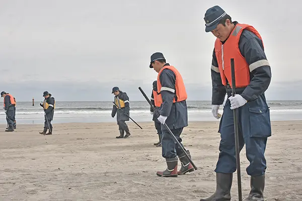 署員たちは被災者の思いなどを背負いながら豊間海岸に場所を移し、海に向かって黙とうをささげ、少しでも多く行方不明者の手がかりを見つけようと、警杖(けいじょう)で砂浜を探り、漂着物を手に取り、消波ブロックの間などを丁寧に捜索した。