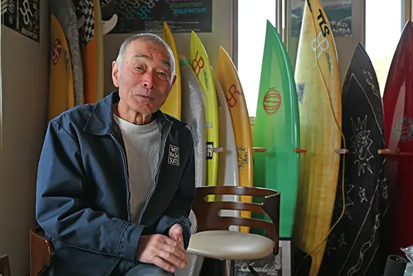 (写真:震災後を振り返る老舗サーフショップ、スローダンサー店主の鈴木孝史さん)