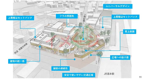 湯本駅前の交流拠点整備事業では、建設から40年以上が経過して老朽化が著しい支所と公民館、多目的ホール、図書館機能の移転が予定されている。