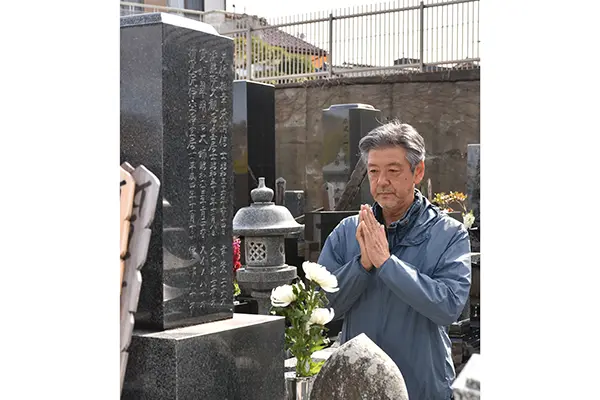 (写真:家族が眠る墓に手を合わせる伊藤さん=冷泉寺)