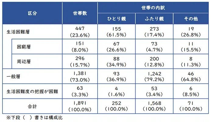 このうち2つ以上に該当する世帯を「困窮層」(151世帯)、1つの場合は「周辺層」(296世帯)とし、両者を合わせて「生活困難層」(計447世帯)と定義し。ゼロについては「一般層」(1381世帯)としている。