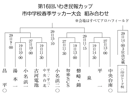第16回いわき民報カップ市中学校春季サッカー大会(NPO法人いわきサッカー協会主催、同協会3種委員会主管、市教委後援、いわき民報社協賛)の組み合わせが決まった。