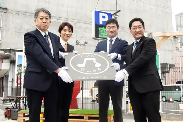 12日には平字三町目でオープニングセレモニーが行われた。運営主体・たいらまちづくりの山崎建見代表取締役が「ほこみちを通じ、皆さんとトライ&エラーで、平の街の活性化につなげていきたい」とあいさつ。利用窓口となるNPO法人タイラボの北林由布子代表、内田市長、県いわき建設事務所の栗田豊己所長とともに、歩道にたいらほこみちのレリーフを設置した。