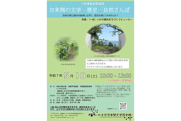 市勿来関文学歴史館は、5月10日に勿来の関公園で実施する特別事業「いわきあるき2025 勿来の関文学・歴史・自然さんぽ」の参加者を募集している。いわき観光まちづくりビューロー共催。先着10人で、事前申し込みが必要。