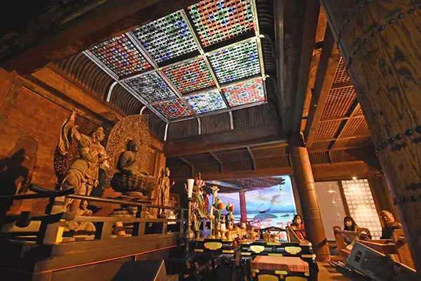庭園内のマツ、モミジ、クスノキなどをライトアップしているほか、お堂内の天井や壁に四倉町の映像制作会社「シャンメ」が手掛けたプロジェクションマッピングを投影。かつてお堂の天井に描かれたとされている色鮮やかな「宝相華」などが、極楽浄土の世界に向かう幻想的な映像で表現されている。