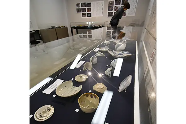 磐城平城への理解を深めてもらうため、2019(令和元)、20年度に実施された同城本丸御殿跡、21年度に行われたJRいわき駅南側の田町曲輪・内堀跡の発掘調査で見つかった陶器や磁器の椀、皿、急須、小壺、石硯、丸瓦など76点が、発掘調査時の写真や資料と一緒に飾られ、歴史ファンたちの熱視線を集めている。