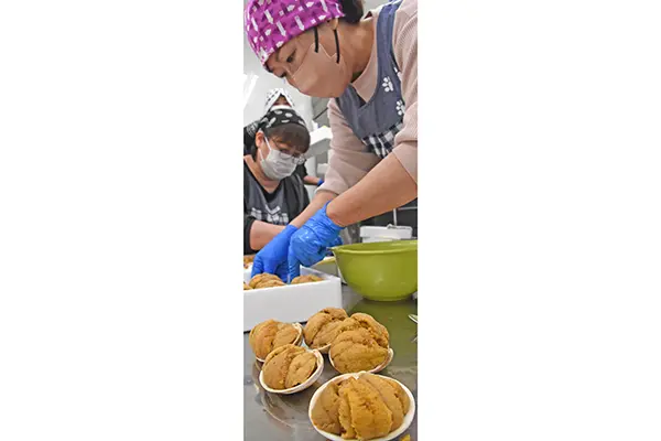 (写真:取れたてのウニをぜいたくに盛り付ける「貝焼き」づくり)