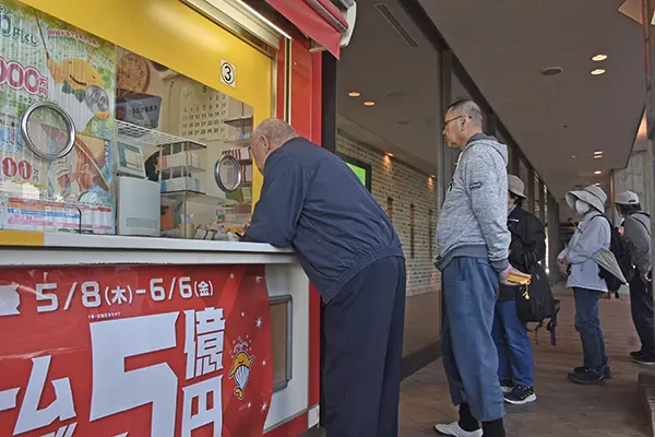 (写真:初日から買い求める人が列をつくった平一町目宝くじセンター)