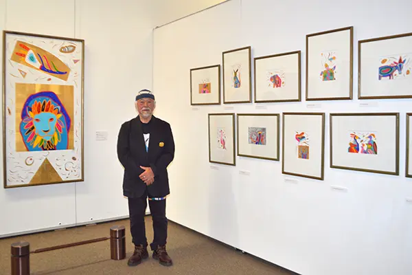このうち会場の一角には、いわき市出身の画家峰丘さんが親交のあった谷川さんの詩を赤、黄、青、緑色など鮮やかな色彩と金箔技法を取り入れ、独特のタッチで表現した変形100号の大作「動物たちのカーニバル『ライオンのおうさま』」1点、サムホール(22・7cm×15・8cm)の「動物たちのカーニバル」13点の原画が展示され、来場者の目を引いている。