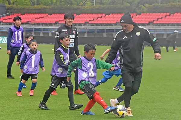 サッカー元日本代表の小野伸二さんによる小学1~6年を対象にしたサッカー教室イベント「Jリーグ×小野伸二 スマイルフットボールツアー for a Sustainable Future supported by 明治安田」が10日、ハワイアンズスタジアムいわきで開催された。約130人の小学生が参加し、小野さんからサッカーの楽しさを教わった。