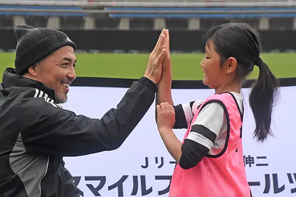 約1時間半にわたるプログラムを終えると、「みんなうまくなりたいと思えたかな。サッカーは楽しいでしょ。誰よりも練習して、たくさんボールに触って」と笑顔で優しく語りかけた小野さん。最後は全員とハイタッチして締めくくった。