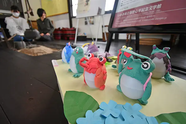 緑、青、赤、紫などカラフルな紙粘土を用いて、タマゴのランタンの外側に自由にカエルたちを造形。42個が生家のところどころに置かれ、ニッコリ笑顔で手を挙げてあいさつをするなど、チャーミングな姿に来場者たちもほっこり。カエルの折り紙体験などもでき、この時期、生家はカエル一色となる。