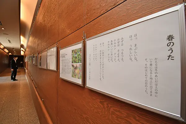 企画した柳内博明館長は「心平が愛した花々を四季を通して届けることにより、心平の世界がさらに広がれば幸い」としており、会場にはオキナグサが記載された「上小川村」=「牡丹園」1948年=、「ケルルンクック。」の一節で知られ、イヌノフグリが登場する「春のうた」のほか、福寿草、ノビル、ツバキなど20点余に及ぶ作品と、植物などの解説パネルが展示されている。