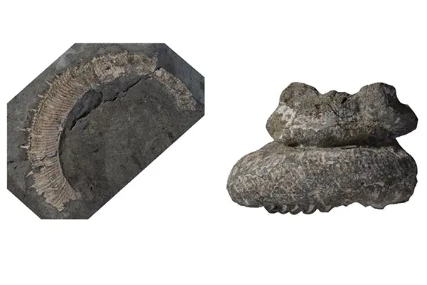(写真:エゾセラス・エレガンス=右、シュードオキシベロセラスの化石)