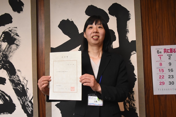 任命式は2日、市役所本庁舎で開かれ、内田市長から三瓶さんに委嘱状が手渡された。