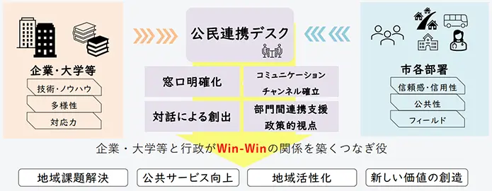 市は4日、企業や団体、高等教育機関のアイデアを生かし、地域課題の解決を目指す窓口「公民連携デスク」を政策企画課に設置した。企業等からの提案にワンストップで対応し、関連する分野の部署を選定するほか、担当者を決めて対話をすることで連携事業の可能性を探る。県内では福島市に次ぐ2例目の取り組み。
