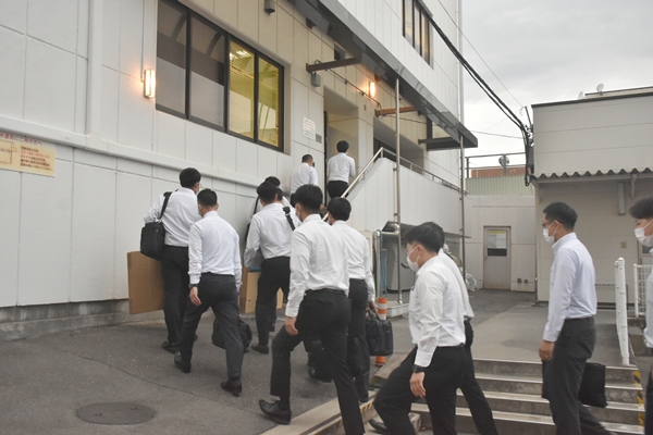 (写真:市水道局の家宅捜索に入る県警の捜査員=18日午後6時31分)