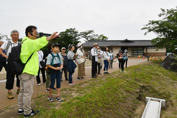 本丸跡では、御殿の遺構図や復元図などの資料を見せ、参加者がありし日の姿を立体的に想像できるよう玄関や池の位置を教えながら、丁寧に発掘調査の成果を報告。