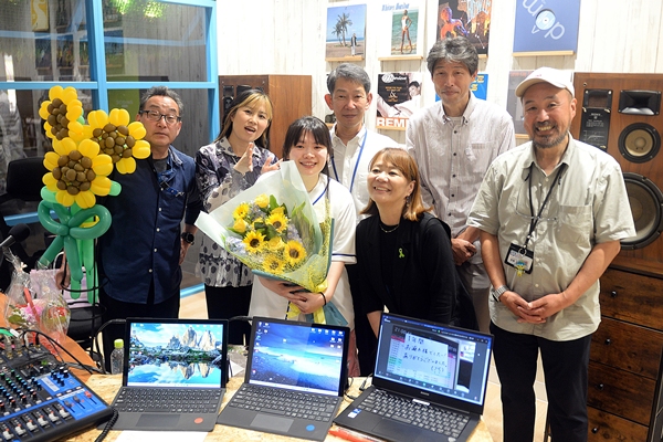 (写真:FMいわきのパーソナリティー、スタッフに囲まれて記念撮影する富田さん)