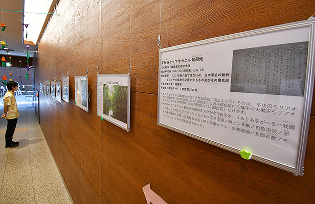 写真はすべて柳内館長が来訪した際に撮影したもので、産卵行動に至る雌雄の逢瀬から、弱肉強食の生存競争の厳しさも伝えるモリアオガエルの生態を、心平の2編の詩で表現する工夫を施した。「天山文庫」をはじめ同村と強い絆のあった心平のひととなりもうかがえる内容となっている。