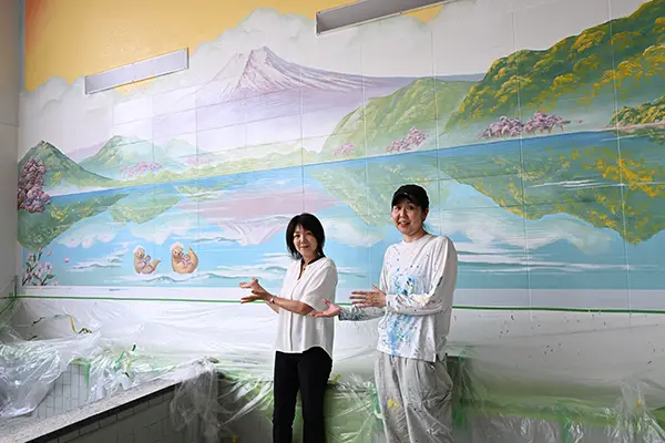 施設を運営する磐城実業株式会社(宮野由美子代表取締役)が世界に誇る公衆浴場の日本文化を見直し、再認識してもらおうと、日本に3人しかいないという銭湯ペンキ絵師のひとり田中みずきさん(東京)に依頼して完成させた。