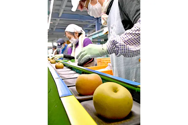 この日は関係者約80人による操業開始式が行われた後、ベトナムに輸出する梨を運搬するトラックの前で、JA福島さくらの志賀博之・代表理事組合長、渡辺一男・梨選果場運営委員会委員長らがテープカットした。担当者はベルトコンベヤーを流れる梨のサイズを選別し、透過式光センサーで糖度、熟度を確認しながら順次箱詰めした。