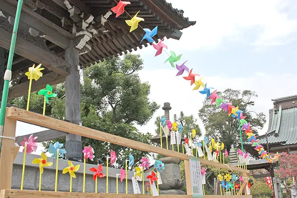 後田町の宝徳院(生駒祐健住職)では、今年から初めて「夏詣 かざぐるま祭り」を開催し、参道や境内に約700基の風車を展示している。