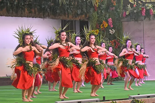 全国の高校生がフラ・タヒチアンを競い合う「文部科学大臣杯 2025年全国高等学校フラ競技大会『第13回フラガールズ甲子園』」の入賞校によるエキシビションが18日、スパリゾートハワイアンズで行われた。
