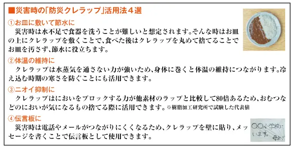 パッケージには災害時にクレラップがどのように活用できるか一目で分かるよう写真を掲載。節水の用途のみならず、クレラップは水蒸気を通さない力が強いため、身体に巻くと体温の維持に役立つことに加え、においを抑制する働き、壁に貼って伝言板としての活用も伝えている。