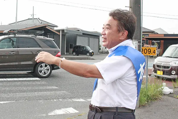 (写真:恒例としている朝の辻立ちで笑顔を見せる清水氏)