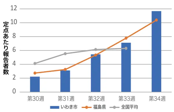 いわき市では新型コロナウイルス感染症が拡大傾向が続いている。県が27日に発表した感染症発生動向調査週報によると、18~24日に市内の定点医療機関から1カ所あたり11・67人(前週比4・56人増)の報告があった。