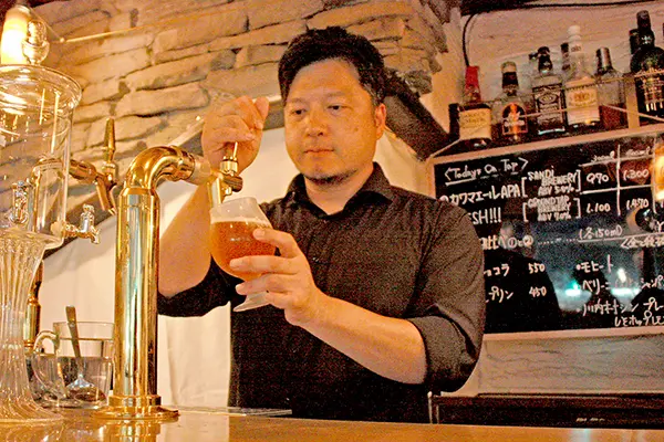 提供しているのは、JRいわき駅前のBar Quartet(バー・カルテット)。オリジナル商品「KAWAMALE(カワマエール)」のアメリカンペールエールで、サーバーの注ぎ口(タップ)からグラスにそそがれる。