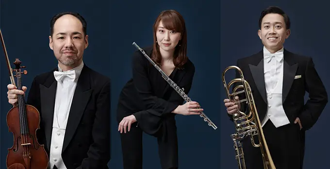 日本を代表するオーケストラ「NHK交響楽団(N響)」の奏者が、いわき市のさまざまな場所に出向いて演奏する「NHK交響楽団いわきアンバサダー」に、本年度は第1ヴァイオリン次席奏者の三又治彦さん、フルート奏者の梶川真歩さん、バス・トロンボーン奏者の黒金寛行さん(植田町出身)の3人が就いた。