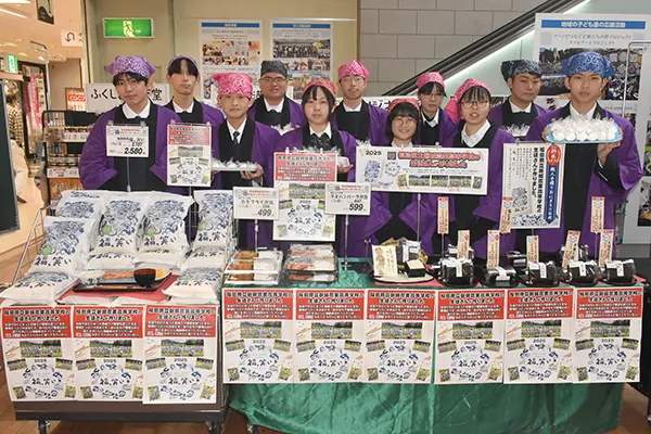 23日の販売実習には、園芸科作物専攻の3年生6人と2年生5人が参加。来店客に対し、炊き立ての米を振る舞いながら、福、笑いの魅力を紹介した。