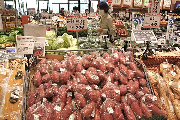 いわき市や茨城県でスーパーマーケットを展開する「マルト」(本社・勿来町窪田、安島浩代表取締役社長)では、双葉郡楢葉町で生産される希少なサツマイモ「あまはづき」を限定販売している。